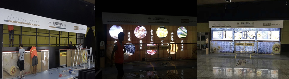 7月在上海地鐵站內(nèi),肯德基KFC推出了新的早餐廣告,以宣傳其早餐新品“握的大飯團(tuán)”。徐家匯地鐵站內(nèi)的觀眾可以在現(xiàn)場(chǎng)看到“金牌飯團(tuán)站”。肯德基KFC“握的大飯團(tuán)”制作過程中的每一步驟,以地鐵進(jìn)站的方式即時(shí)體現(xiàn)在液晶拼接屏幕上,同時(shí)按動(dòng)互動(dòng)按鈕可以讓站臺(tái)閘門自動(dòng)開關(guān)達(dá)到與觀眾互動(dòng)的效果。