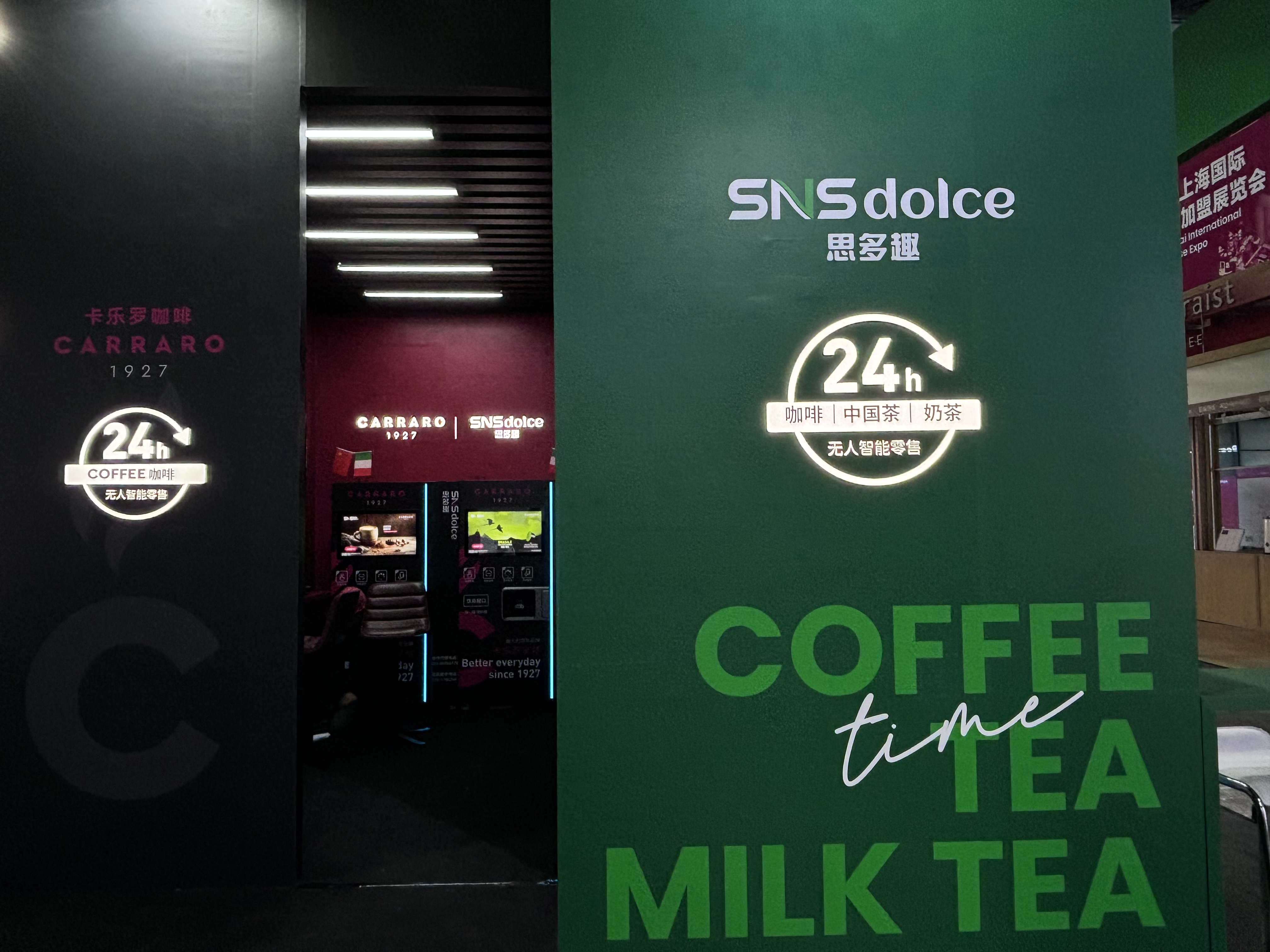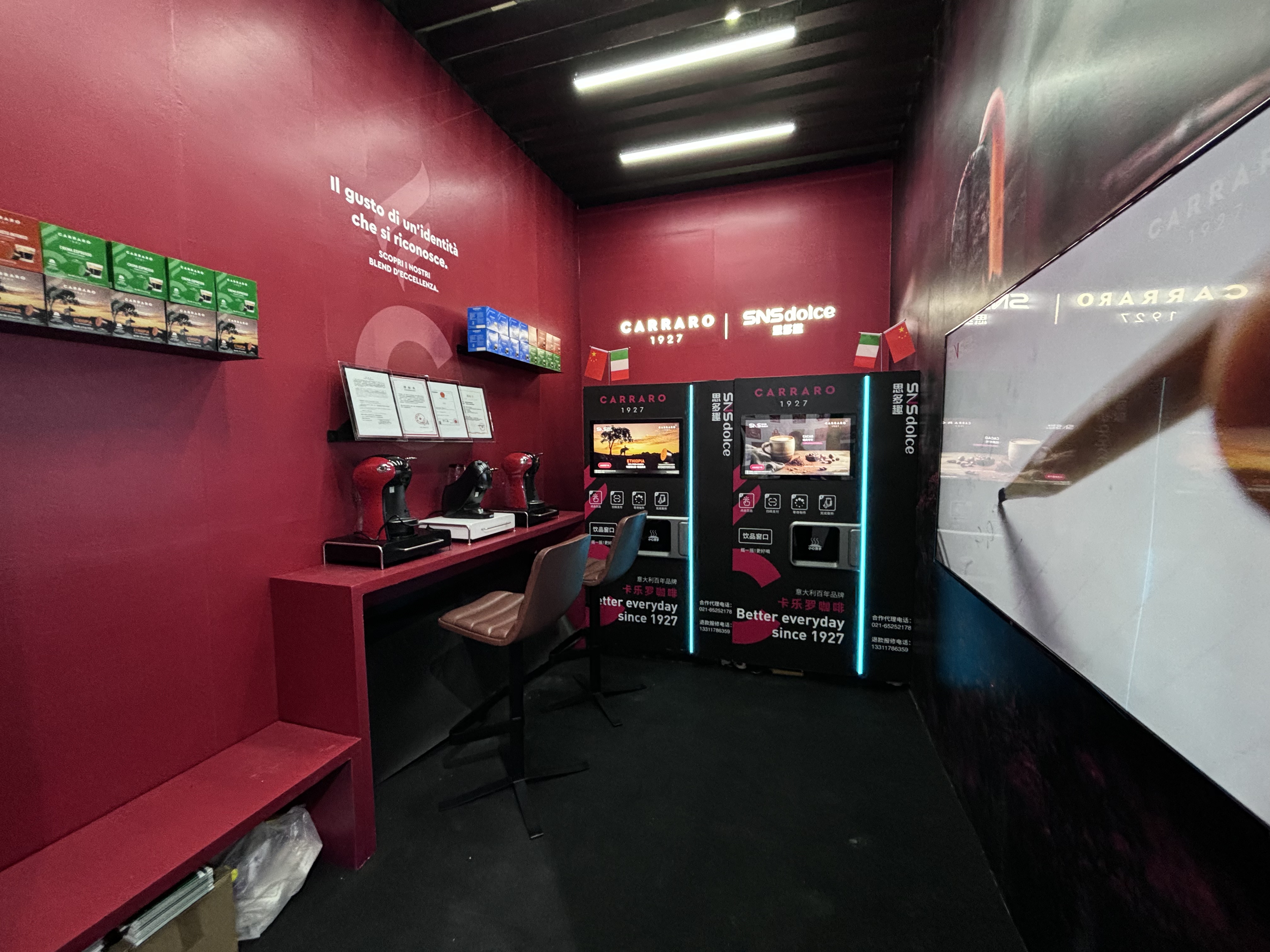 該展位融合了意大利百年咖啡品牌 **CARRARO(卡樂羅,始于 1927 年)與自有品牌SNSdolce(思多趣)** 的資源優(yōu)勢,打造了 “咖啡 + 中國茶 + 奶茶” 的多元產(chǎn)品矩陣。展區(qū)設計上,以紅、綠為主色調(diào)劃分功能區(qū)域:紅色區(qū)域集中展示 CARRARO 的咖啡產(chǎn)品系列,包括咖啡豆、咖啡設備等,墻面的意大利語標語凸顯品牌的意式血統(tǒng);綠色區(qū)域則突出思多趣的 24 小時無人智能零售概念,配備的智能咖啡機支持多品類飲品制作,體現(xiàn) “便捷化、智能化” 的消費體驗升級。