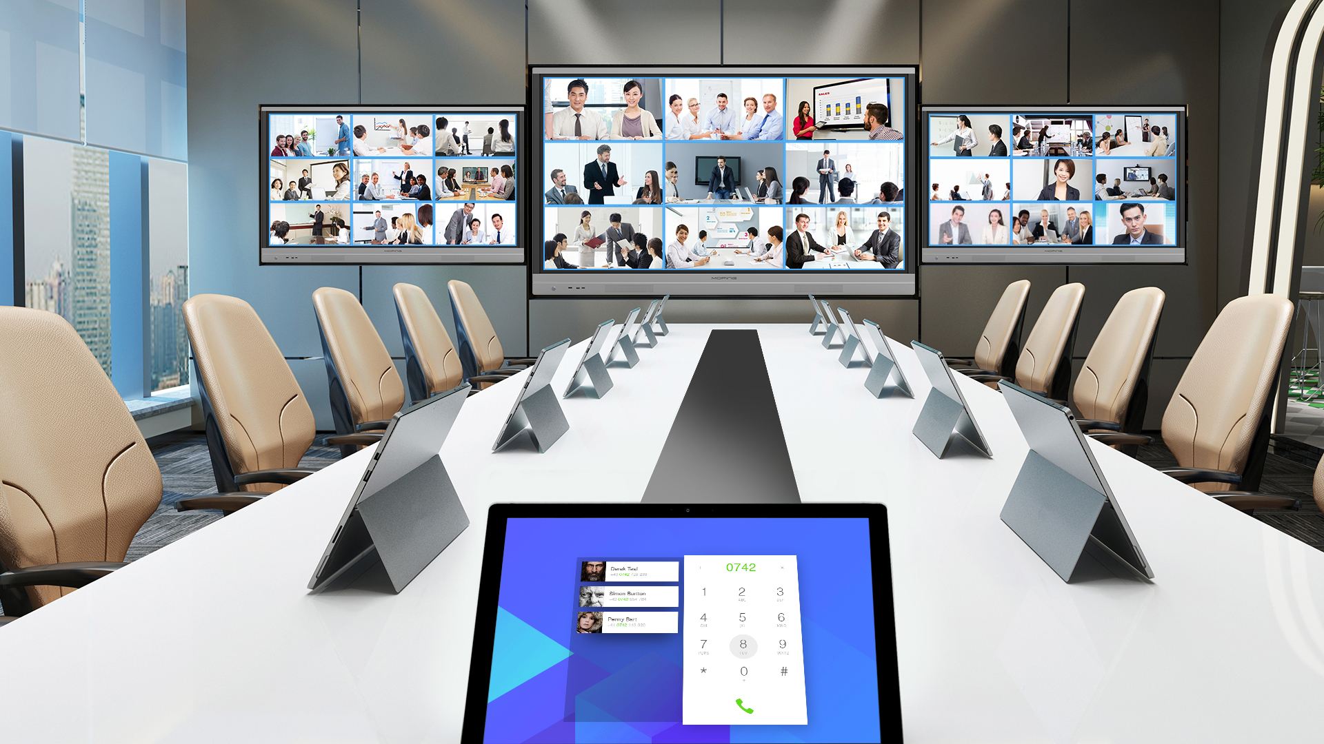 視頻會(huì)議可支持多人多點(diǎn)參加形成會(huì)議。同時(shí),視頻會(huì)議系統(tǒng)具有投影、VGA端口以及數(shù)據(jù)流功能可以隨時(shí)增加會(huì)議與會(huì)者甚至召開全體會(huì)議??偛繘Q策可即時(shí)傳達(dá)到所有員工。