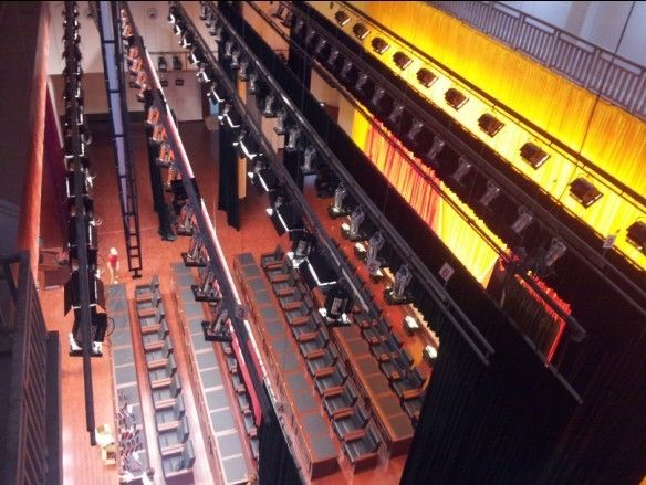 燈光排架是布設(shè)頂光的機(jī)械設(shè)備。采用電動曳引式驅(qū)動,裝燈數(shù)量比燈光吊桿多。燈架形式采用三角形桁架或梯形桁架。